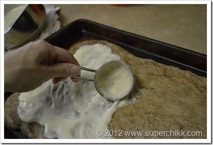 I spread the sauce on the pre-baked crust using a measuring cup. It took almost all the sauce. And I could’ve used it all, but didn’t want to press my luck.
